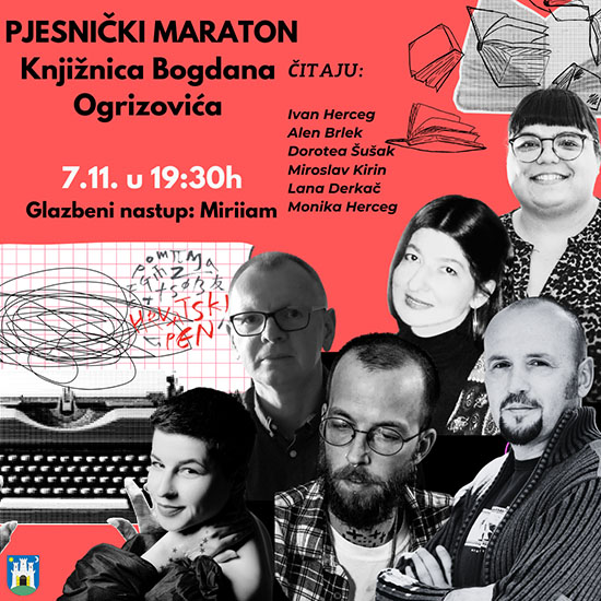 Pozivamo vas na Pjesnički maraton koji će se održati u petak, 7. studenoga, u 19:30 sati, u Knjižnici i čitaonici Bogdana Ogrizovića, Preradovićeva 5, Zagreb.