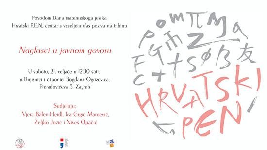 Povodom Dana materinskoga jezika Hrvatski P.E.N. centar s veseljem Vas poziva na tribinu „Naglasci u javnom govoru“, u subotu, 21. veljače, u 12.30 sati, u Knjižnici i čitaonici Bogdana Ogrizovića, Preradovićeva 5, Zagreb.