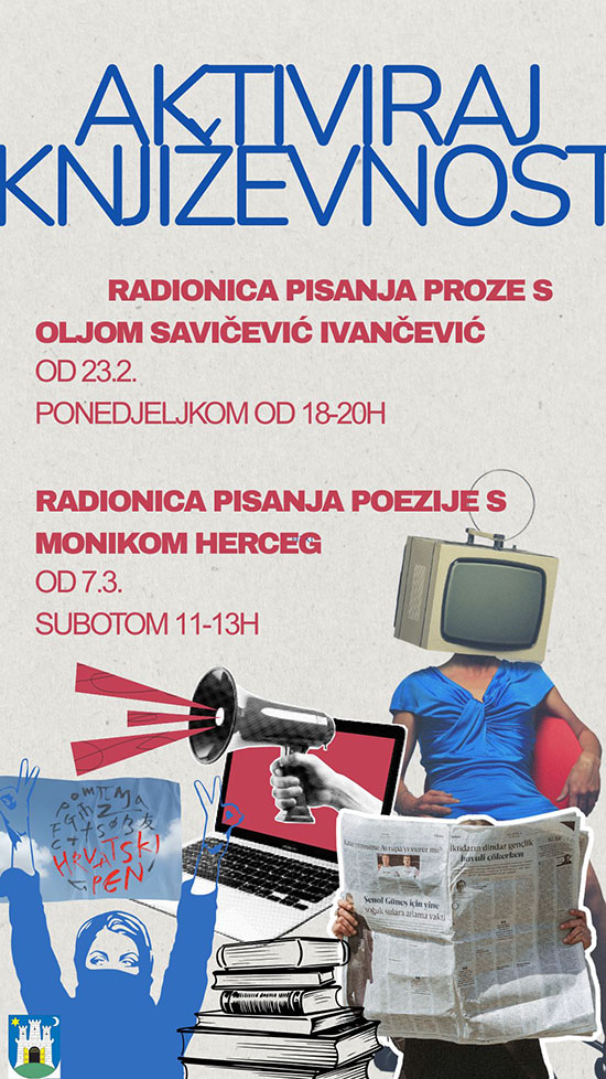 RADIONICA AKTIVISTIČKE PROZE od 23. 2. 2026. ponedjeljkom 18:00 – 20:00 (5 termina) Vodi: Olja Savičević Ivančević Polaznici će kroz mentorski rad razviti i napisati kratku priču koja se bavi društveno relevantnom temom. Radionica je usmjerena na oblikovanje pripovjednog teksta (tema, perspektiva, likovi, struktura) te promišljanje odnosa književnosti i društvenog angažmana.
